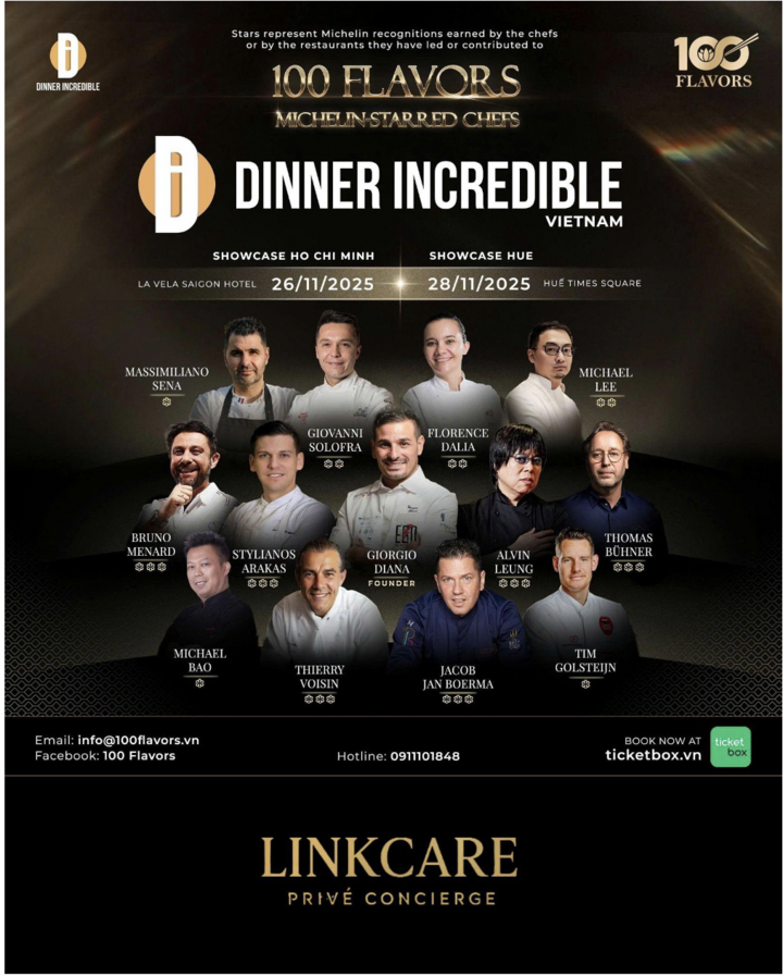 Sự kiện lần này được nâng tầm với sự đồng hành của LinkCare Privé Concierge, thương hiệu concierge và dịch vụ đặc quyền hàng đầu Việt Nam. Với kinh nghiệm phục vụ các tổ chức tài chính, tập đoàn quốc tế và các đoàn doanh nhân từ nhiều quốc gia, LinkCare đảm nhiệm vai trò đối tác hỗ trợ đặc biệt cho 13 đầu bếp Michelin, bao gồm: Hỗ trợ phòng chờ sân bay; Điều phối di chuyển; Sắp xếp trải nghiệm theo yêu cầu cá nhân; Đồng hành xuyên suốt để đảm bảo hành trình suôn sẻ, riêng tư và đạt chuẩn 5 sao.
